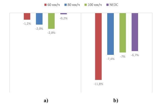 Рис. 2. Изменение расхода топлива на разных режимах движения, в %: a) сравнение варианта № 2 с вариантом № 3; b) сравнение варианта № 2 с вариантом № 1