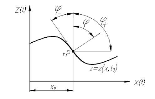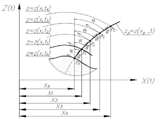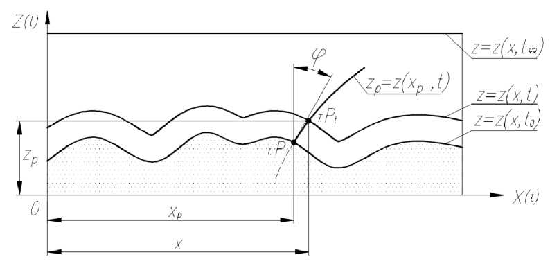 С течением времени происходит эволюция профиля дороги, причины которого на данном этапе не требуют конкретизации (рост снежного покрова; деформация основания; сглаживающая способность шины и пр.). Предполагается только, что изменение профиля дороги происходит перпендикулярно начальному профилю со скоростью . Причем скорость может быть как положительная, так и отрицательная – в зависимости от физической постановки задачи (рост поверхности или ее спад). Рассмотрим произвольную точку (т.P) на начальной поверхности с координатами {xP, zP}, ее эволюция будет происходить по траектории, перпендикулярной – в каждый момент времени t – к текущему профилю дороги z = z(x, t) (рис. 1).