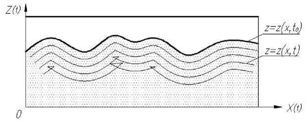 Уравнение (10) описывает рост поверхности движения как поступательное движение неизменяемого профиля (трансляцию). Если абсолютное положение проверхности движения не представляет интереса в рамках конкретной задачи, а исследуется лишь деформация ее профиля, можно перейти к другой переменной: