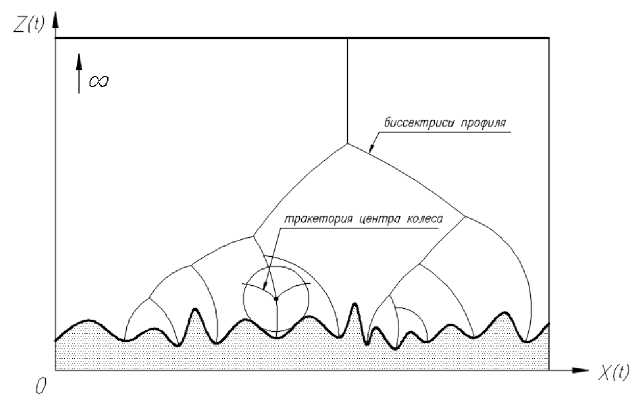 На рис. 9 показаны биссектрисы, соответствующие профилю опорной поверхности. Согласно определению [6], биссектриссой L(M) множества M (область ограниченная сверху профилем опорной поверхности) называется совокупность всех точек из дополнения множества M до плоскости (R2 \ M), которая имеет не менее двух проекций на M. Как следует из определения, биссектриссы профиля являются теми кривыми, на которых траектории центра колеса (при различных радиусах колеса R) терпят разрыв гладкости (оставаясь непрерывными). На рис. 9 показана качественная картина поведения биссекторных кривых (перевернутое дерево): биссектрисы с ростом радиуса катящегося колеса попарно сливаются между собой и в пределе при R → ∞ вырождаются в одну единственную биссектрису. Предельный случай R → ∞ можно переформулировать как качение колеса с конечным радиусом, но по микропрофилю, неровностями которого можно пренебречь.