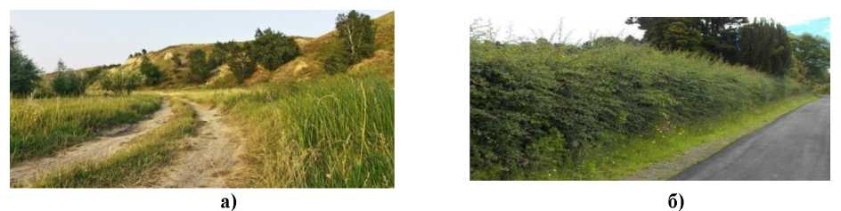 Fig. 1. Examples of obstacles that reduce visibility: a – difficult terrain (hill); b – discrete obstacles (bush)