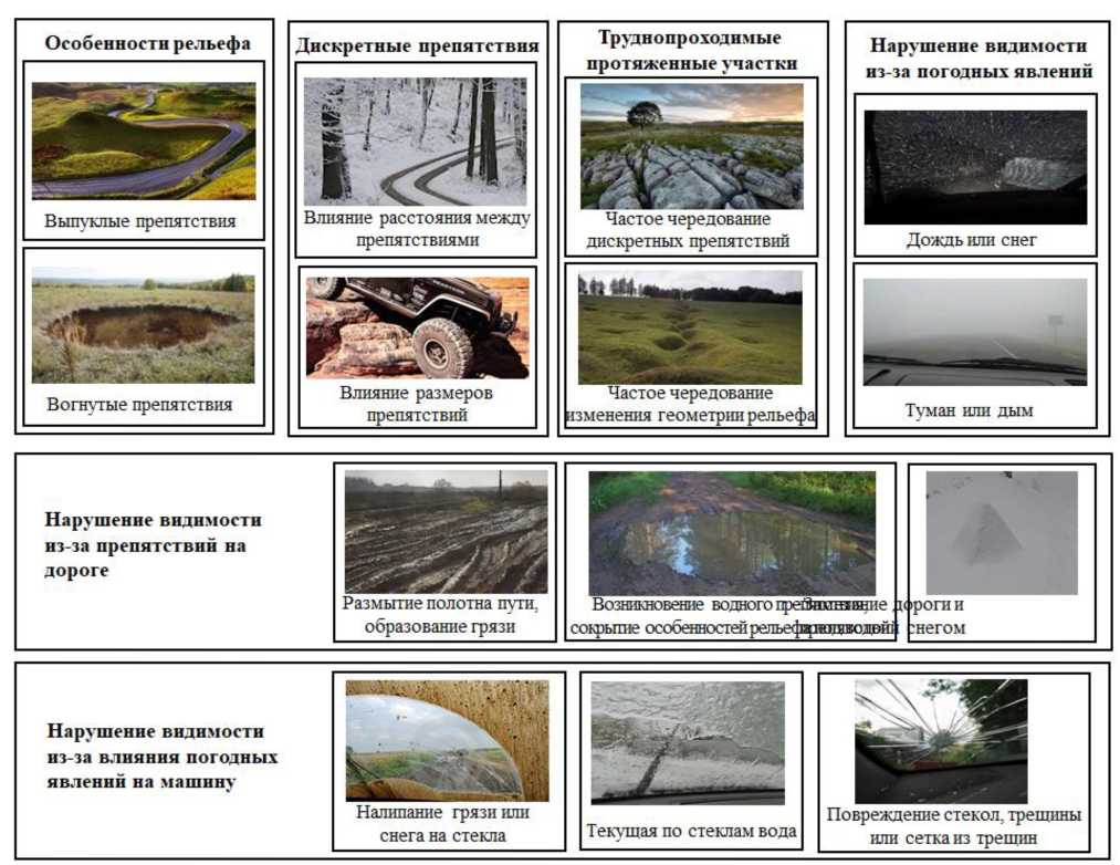 Факторами, оказывающими значительное влияние на видимость, являются также погодные явления. На рис. 2 и 3 представлены схемы с описанием видов препятствий и явлений, влияющих на ограниченность или недостаточность видимости. При бездорожье основным фактором является распределение неровных поверхностей на маршруте движения [3, 4].