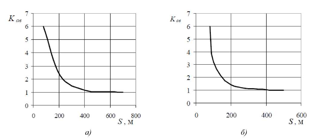В городских условиях снижение скорости проще организовать путем обычного ограничения в 60 км/ч. За городом заблаговременное снижение возможно организовать заблаговременной установкой знаков, ограничивающих скорость и знаков, предупреждающих об опасности. Однако водители, которые изначально нарушают правила дорожного движения, на высоких скоростях не смогут заметить знаки. Их видимость также значительно снижается в темное время суток. Эта проблема решается установкой модернизированных знаков со светоотражающими элементами или подсветкой, что пока реализовано не на всех дорогах. На рис. 4 даны графики зависимости количества ДТП (Кав) от расстояния видимости (S, м), по которым видно, что со снижением видимости вероятность ДТП возрастает.