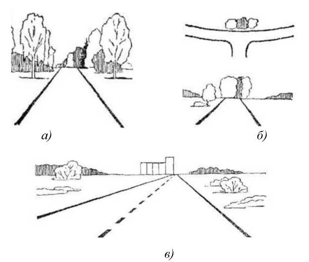 Рис. 5. Повышение информативности дороги: а, б – использование деревьев для подчеркивания направления дороги; в – ориентирование длинных прямых участков дороги на возвышающиеся предметы