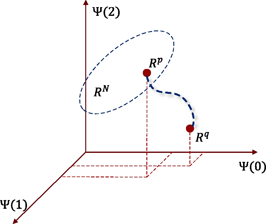 При изменении сигнала напряжения относительно нормальных, заданных в области RN, АКФ также будет меняться. Предположим что сигнал напряжения в момент времени p представлен точкой Rp в области нормальных вариантов АКФ RN. Тогда при изменении сигнала напряжения АКФ в другой момент времени q>p будет представлена точкой Rq на рис. 1. Другими словами, изменения вектора автокорреляционной функции напряжения отражают пространственно-временную эволюцию динамических характеристик напряжения, что имеет большое значение для понимания и прогнозирования нарушений напряжения. Выявленный в векторном пространстве АКФ дрейф за пределы области RN нормального динамического поведения системы означает, что в момент времени q обнаружено нарушений напряжения.