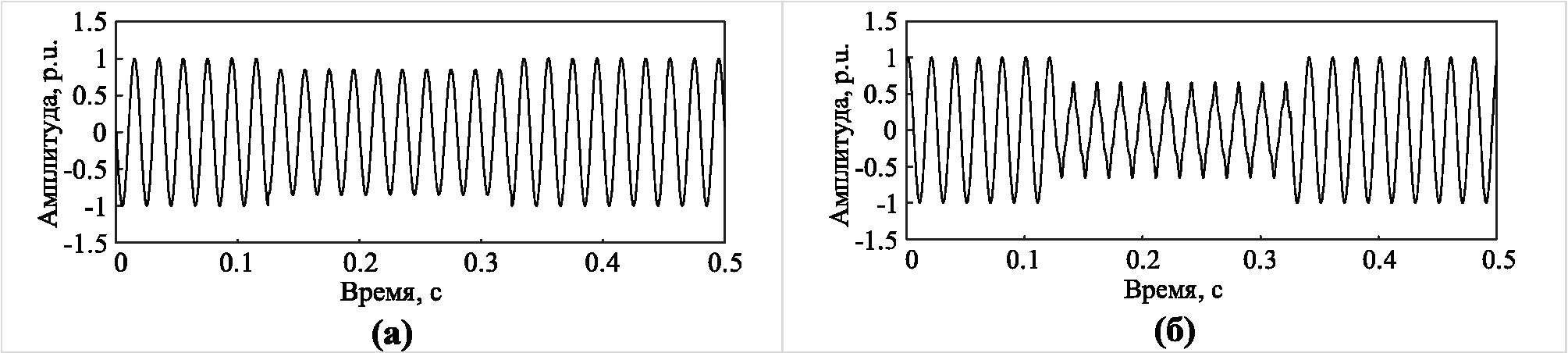 Сигнал напряжения u(n) с провалом 15 % показан на рис. 3. Падение напряжения происходит с момента 0,12525 сек до 0,32500 сек. Амплитуда показана в относительных единицах к номинальному уровню напряжения и обозначена по международным правилам как «p.u.» (per unit).