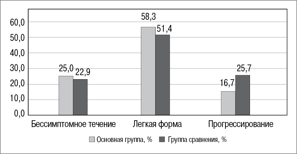 Бессимптомное и легкое течение нового коронавирусного заболевания наблюдалось у 3 (25%) и 7 (58,3%) пациенток из 12 инфицированных женщин основной группы и у 8 (22,9%) и 18 (51,4%) наблюдаемых из 35 инфицированных пациенток группы сравнения соответственно (рис. 2). При этом было отмечено, что дальнейшее местное использование препарата Виферон® способствовало уменьшению длительности инфицированности и течения данного заболевания.