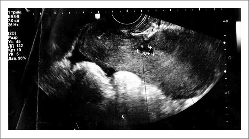 По данным ультразвукового исследования органов малого таза матка имела размеры, соответствующие 8 нед беременности, с ровными наружными контурами. В несколько расширенной полости матки и цервикального канала диагностированы гиперэхогенные включения с акустической тенью. В области послеоперационного шва обнаружены жидкостные включения до 16 мм в диаметре (рис. 2). Уровень жидкости за маткой составлял 4 мм.
