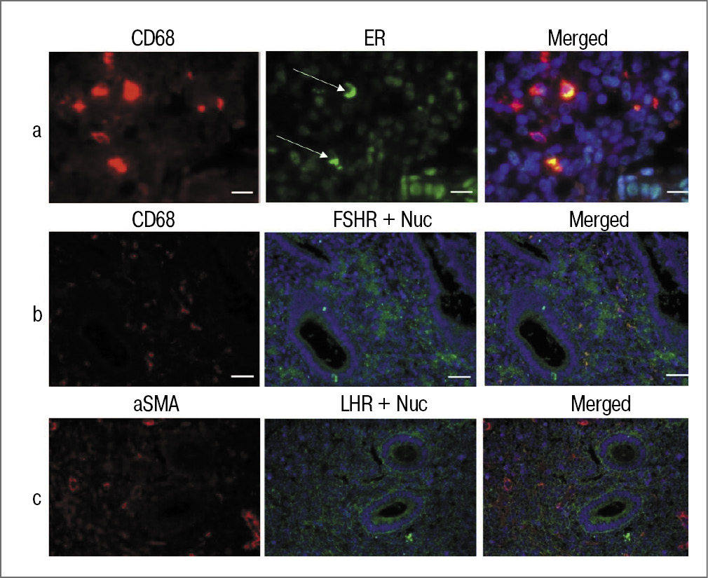 Рис. 2: a – экспрессия ER в цитоплазме отдельных макрофагов (масштабный отрезок – 15 um); b – экспрессия FSHR в макрофагах; c – экспрессия LHR в миофибробластах (масштабный отрезок – 50 um).