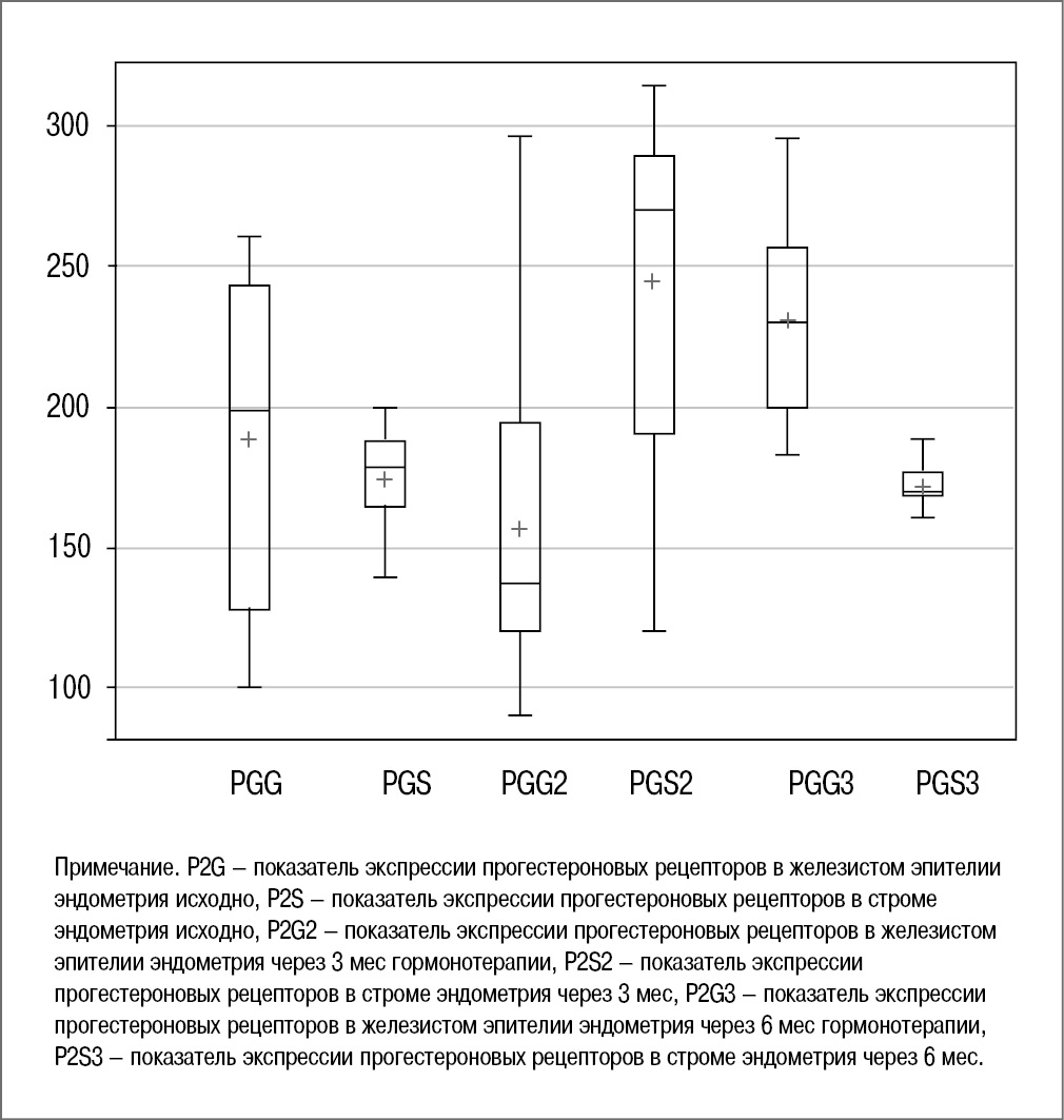 Через 3 мес гормональной терапии при оценке показателя экспрессии рецепторов к прогестерону в железах (PGG2) выявлено снижение медианы в 1,3 раза, и она смещалась к 1-му квартилю (нижняя граница «ящика с усами», или 25-й перцентиль). При этом в строме (PGS2) наблюдалось увеличение медианы в 1,6 раза и смещение к 3-му квартилю (верхняя граница «ящика с усами», или 75-й перцентиль). Полученные данные указывают на то, что в первую очередь на прогестерон реагируют клеточные элементы стромы, способствующие восстановлению слизистой полости матки после извлечения патологически измененного эндометрия, приведшего к аномальному кровотечению. Для активизации рецепторного аппарата железистого эпителия гормональное воздействие в течение 3 циклов терапии, очевидно, недостаточно.