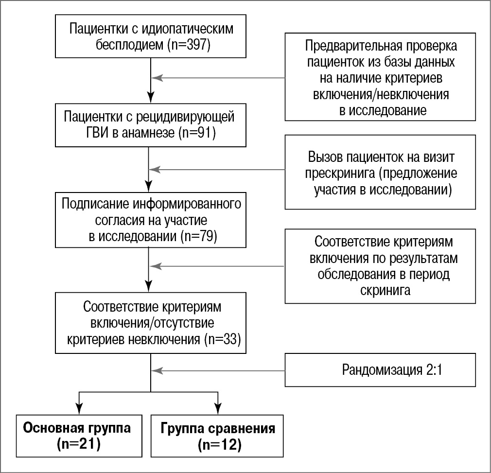 Общий дизайн исследования. С октября 2020 по ноябрь 2021 г. включительно проведено проспективное открытое рандомизированное сравнительное исследование по оценке эффективности применения препарата Аллокин-альфа® − лиофилизат для приготовления раствора для подкожного введения 1,0 мг (олигопептид гистидил-глицил-валил-серил-глицил-гистидил-глицил-глутаминил-гистидил-глицил-валил-гистидил-глицин, rlsnet.ru) в комплексном лечении ХЭ у пациенток с идиопатическим бесплодием, рецидивирующей ГВИ. В исследование включены 33 пациентки репродуктивного возраста (от 25 до 38 лет, медиана возраста – 31 [29; 32, 5] год), соответствующие критериям включения и не имеющие критериев невключения. Исследование состояло из периодов скрининга, рандомизации, лечения и наблюдения. В период скрининга проводилась селекция и обследование пациенток из базы больных с рецидивирующей ГВИ, локализованной в области гениталий. За период скрининга выполнялось морфологическое и иммуногистохимическое (ИГХ)-исследование аспират-биопсии эндометрия на предмет наличия ХЭ. Также проводилось исследование микробиоты эндометрия. После завершения лечения через 3 мес повторно оценивали микробиоту полости матки пациенток, а также проводили гистологическое и ИГХ-исследование биоптатов эндометрия, при этом забор материала из полости матки до и после лечения проводили на 19–21-й день менструального цикла. Наблюдение за пациентками составило не менее 6 мес, медиана наблюдения – 8,8 мес.