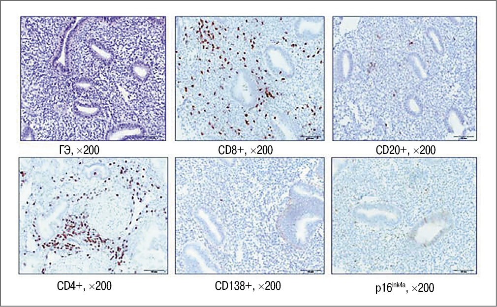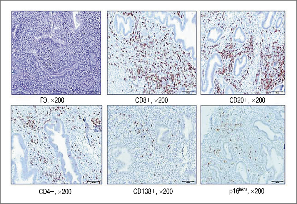 Гистологическое и ИГХ-исследование. На этапе селекции у всех пациенток морфологически верифицирован ХЭ. Гистологическое исследование проводили по классической методике на микроскопе Olympus CX31 (Япония) при увеличении ×100, ×400. Для обзорной окраски использовали гематоксилин и эозин. Для диагностики ХЭ использовали антитела СD8+ [клон СD 8/144B] в стандартном разведении 1:50; СD20+ [клон L26] в стандартном разведении 1:40; СD4 [клон 4 В12] в стандартном разведении 1:50 и СD138+ [клон М115] в стандартном разведении 1:50 производства Dako Cytomation. Для количественной и качественной оценки экспрессии ингибитора циклинзависимой киназы p16ink4a использовали набор CINtec p16ink4a Histology Kit (Roche, Germany). Степень выраженности ХЭ определяли по совокупности гистологического и ИГХ-исследований (фибропластические изменения, склероз сосудов, мононуклеарная инфильтрация в строме) и количественной оценке комбинации антител цитотоксических Т-лимфоцитов (CD8+), В-лимфоцитов (CD20+), Т-хелперов (CD4+), плазмоцитов (CD138+) по шкале, разработанной Г.Х. Толибовой и соавт. [11].