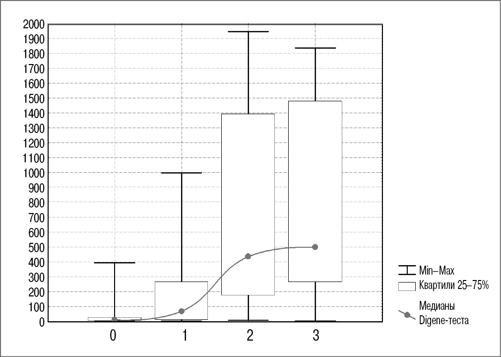 Результаты цитологического исследования были разделены на 6 категорий: без особенностей (норма), неспецифический вагинит, цервицит, CIN1, 2, 3. Однако 60 (72%) из 83 случаев относились к категории «без особенностей» – условное обозначение «нулевая», а остальные распределены по прочим 5 категориям в количестве от 2 до 7, т.е. нерепрезентативно. Поэтому неспецифический вагинит и цервицит были объединены в одну группу (условное обозначение «первая» – 10 случаев), а CIN1, 2 и 3 – в другую (13 случаев). Влияние принадлежности пациенток к этим группам не оказывало значимого влияния на уровень Digene-теста (χ²=5,2; p>0,07). Тем не менее, как показано на рис. 2, по мере развития воспалительных процессов уровень Digene- теста в сравнении с нормой возрастает – Ме=196,3 (Q1=72,5; Q3=911,9) при развитии неспецифического вагинита и цервицита и Ме=241,7 (Q1=105,5; Q3=968) при CIN против Ме=39,4 (Q1=5,6; Q3=473) в норме, но значимый (Z=3,4; p<0,001) рост имел место только в случае развития CIN. При этом между двумя последними группами значимых и, как показано выше, существенных различий нет (Z=0,3; p>0,76).