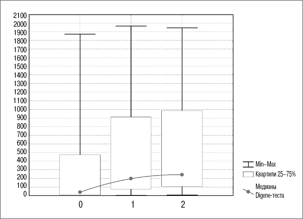 Рис. 2. Зависимость уровня Digene-теста от принадлежности пациенток к группам с нормальным, предраковым и раковым состоянием шейки матки по данным цитологического исследования. По оси абсцисс отмечены категории пациенток по данным цитологического исследования: 0 – без особенностей (норма), 1 – неспецифический вагинит и цервицит, 2 – CIN1, 2, 3. По оси ординат – значения Digene-теста.