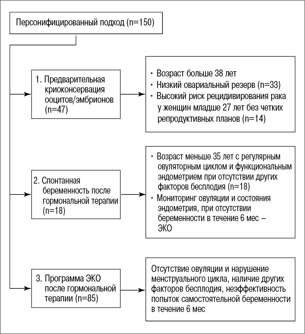 Рис. 1. Персонифицированный подход к достижению беременности у пациенток с атипической гиперплазией и РЭ IA-стадии в анамнезе. / Fig. 1. The personalized approach of infertility treatment in patients with prior atypical endometrial hyperplasia and endometrial cancer treatment.