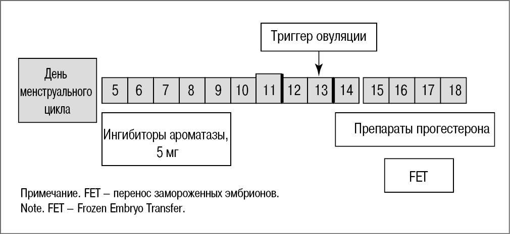 Основанием для использования специального протокола стал факт отсутствия у пациенток регулярного менструального цикла и овуляции, следовательно, осуществить перенос в естественном цикле мы не могли. С другой стороны, было небезопасно назначать заместительную терапию, предполагающую введение значительных доз экзогенных эстрогенов. Исходя из этих ограничений, мы проводили стимуляцию яичников ингибиторами ароматазы для обеспечения монофолликулярного роста. В качестве триггера овуляции назначали агонисты ГнРГ. Лютеиновую фазу поддерживали препаратами прогестерона.