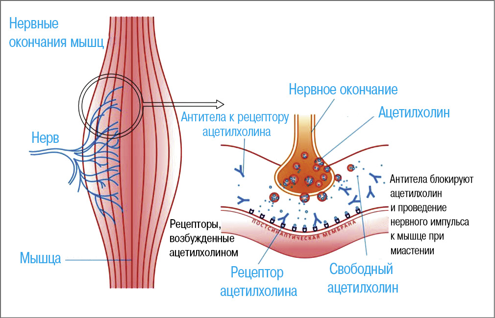 Миастения – аутоиммунное заболевание, в основе которого лежит патологическая выработка антител к ацетилхолиновым рецепторам постсинаптической мембраны нервно-мышечного синапса, что приводит к уменьшению количества функционирующих рецепторов концевой пластинки и в конечном итоге нарушению сокращения мышечного волокна (рис. 1) [1].