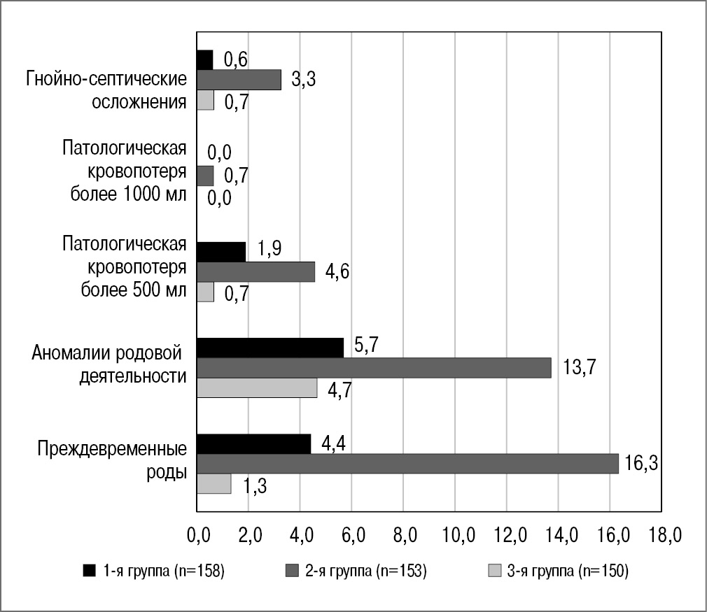 Частота аномалий родовой деятельности в 2,3 раза превышала данный показатель у пациенток 1-й и контрольной групп, отмечено статистически значимое увеличение частоты послеродовых кровотечений, гнойно-септических осложнений в послеродовом периоде (р<0,001); рис. 2.