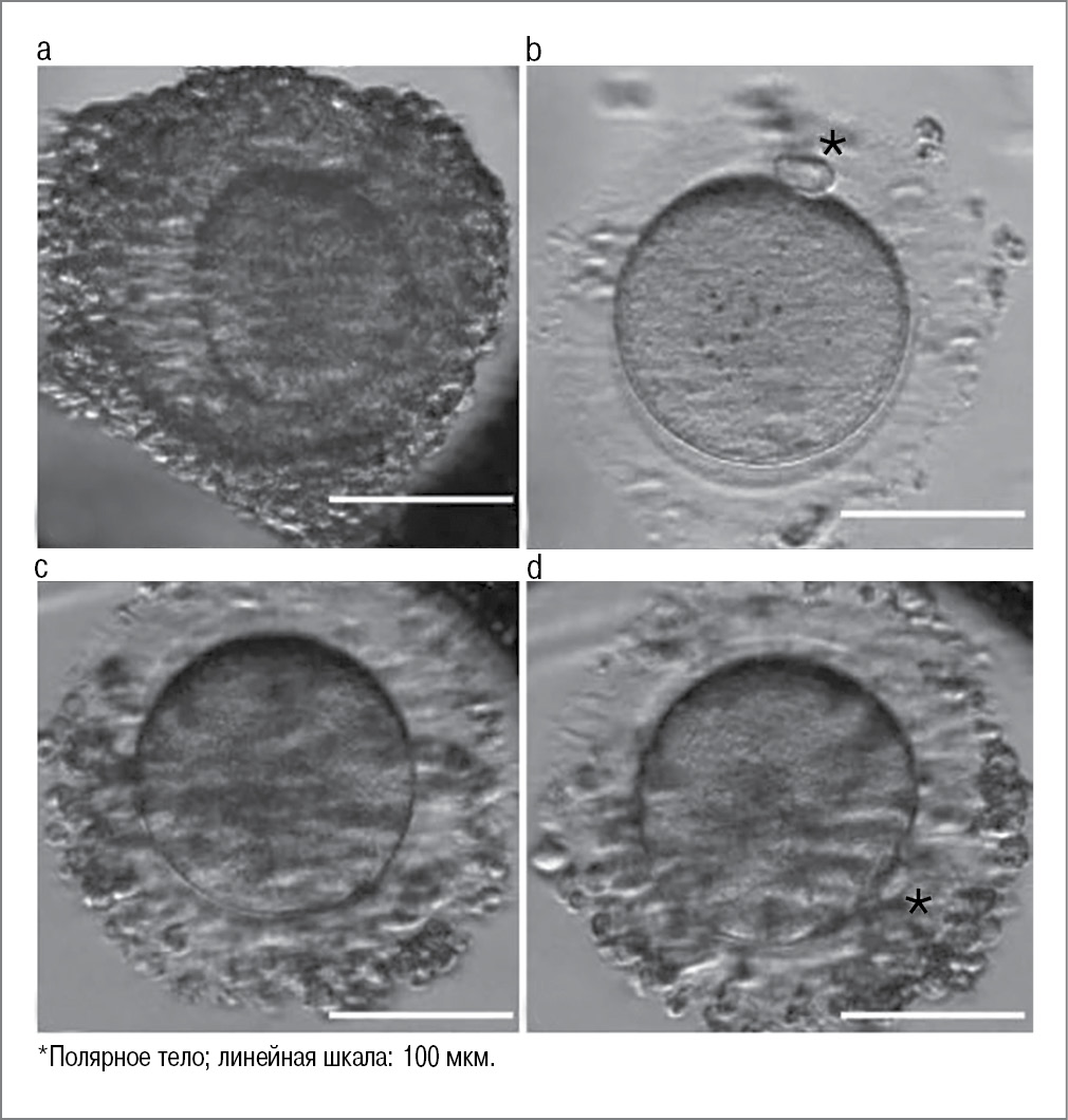IVM представляет собой метод созревания незрелых комплексов ооцит-кумулюс (КОК) в среде от профазы I (от стадии зародышевого пузырька GV) через мейоз I до достижения M II (рис. 1), после их получения из антральных фолликулов [15, 25, 26]. Несмотря на то что данная методика используется уже несколько десятков лет, она все еще является альтернативой для пациенток с высоким риском гиперстимуляции яичников, а именно при СПЯ, но применение у женщин с онкологической патологией до сих пор остается спорным [16].
