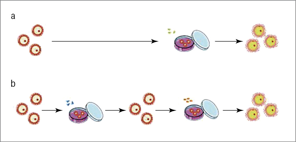 Fig. 2: a – monophasic in vitro maturation – IVM (from GV to MII without intermediate medium); b – biphasic IVM (arrest in the medium at the GV stage, then transfer to the IVM medium).