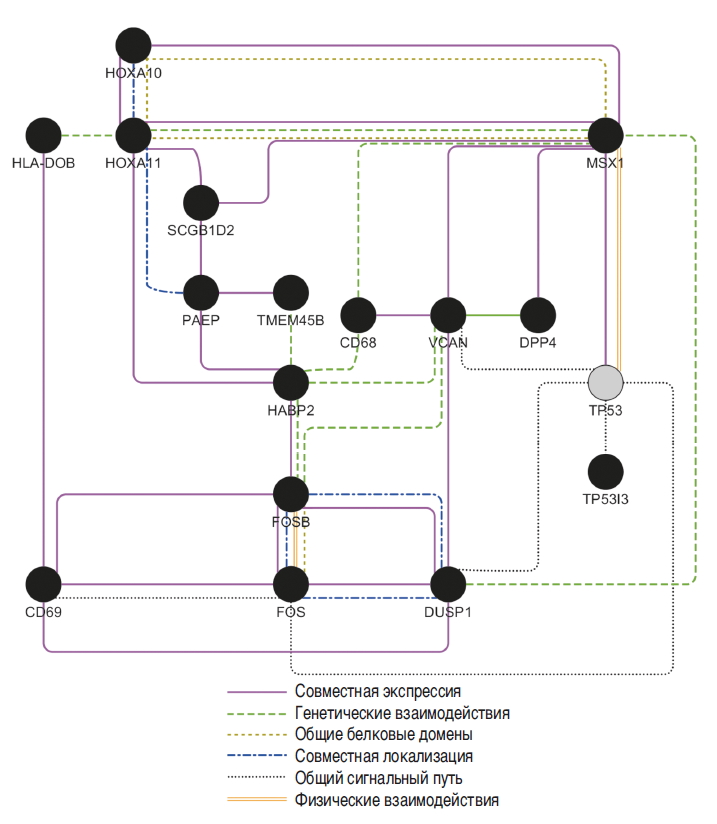 По данной формуле можно подсчитать, что для сочетаний по 3 гена существует примерно в 13,5 тыс. раз больше вариантов. Для анализа такого количества сочетаний транскриптов необходимо использование суперкомпьютера. В связи с этим был произведен предварительный отбор генов, которые потенциально могут играть роль в определении исходов программ ЭКО. Поскольку биологический смысл пар и троек, как уже было сказано, заключается в суммации эффектов изменения экспрессии нескольких генов с взаимосвязанной функцией, то было отобрано 16 генов, образующих сеть взаимосвязей и играющих роль в определении рецептивности эндометрия. Данные 16 генов образуют сеть взаимосвязей, таких как генетические и физические взаимодействия, совместная экспрессия и локализация, общие белковые домены и сигнальные пути (рис. 1).