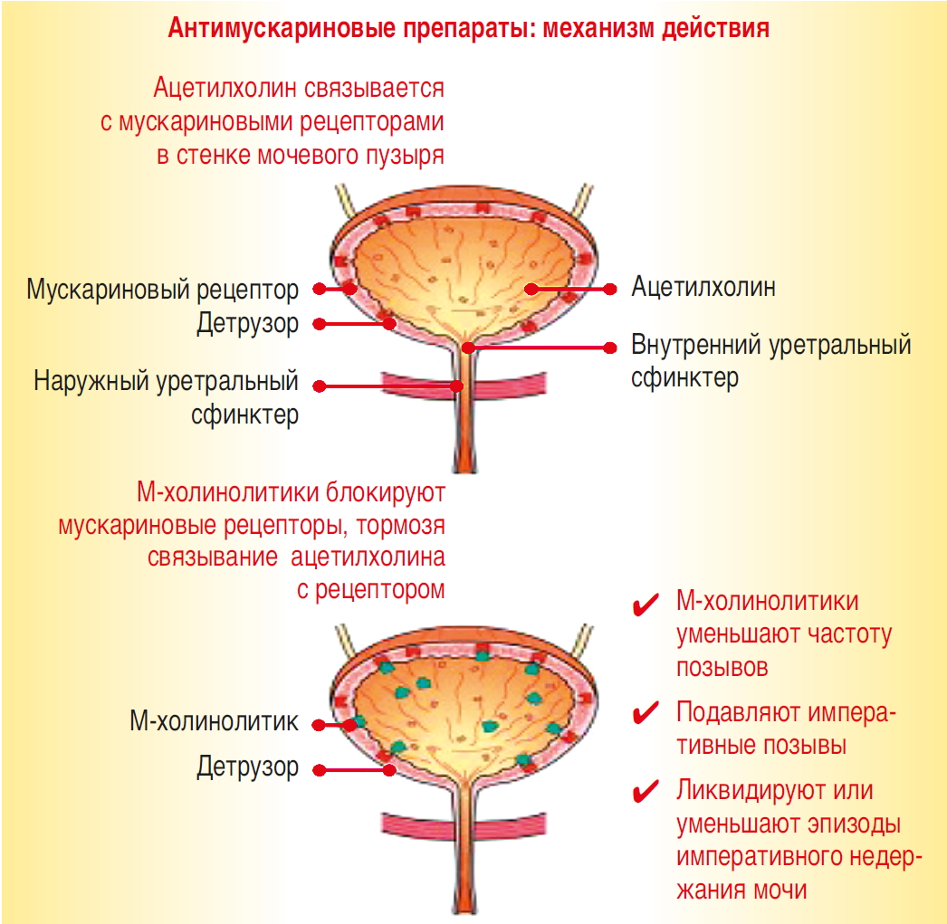 Медикаментозная терапия является основополагающей в лечении императивных нарушений мочеиспускания [11, 12]. Препаратами 1-й линии для лечения ГАМП являются М-холиноблокаторы (степень доказательности А). Блокада М-холинорецепторов сопровождается стереотипной реакцией детрузора, которая выражается в его расслаблении в фазу наполнения, увеличении резервуарной функции мочевого пузыря. Вследствие этого достигаются существенные позитивные изменения функционального состояния нижнего отдела мочевого тракта, что выражается в исчезновении поллакиурии, нормализации суточного профиля мочеиспускания, сокращении эпизодов недержания мочи (см. рисунок) [11–13].