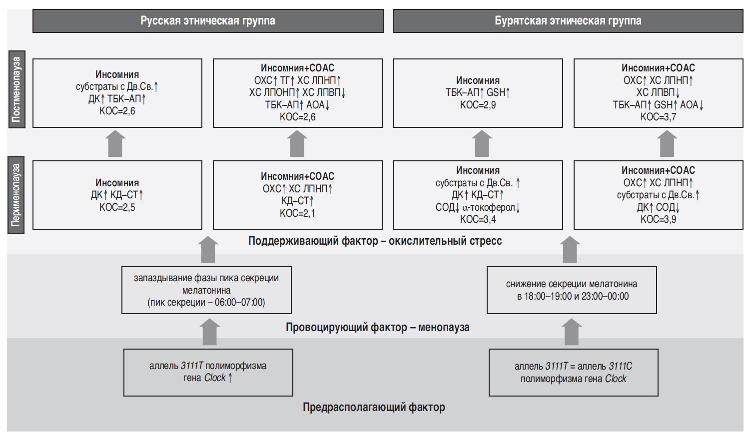 Базовой моделью патогенеза инсомнии в настоящее время принято рассматривать модель «Трех П», предложенную в 1987 г. А. Spielman. Согласно данной модели факторы, участвующие в формировании инсомнических расстройств, делятся на предрасполагающие, провоцирующие и поддерживающие [23]. Полученные в данном исследовании результаты позволили составить на основе модели «Трех П» концептуальную схему изменения метаболических показателей у женщин 2 этнических групп с сомнологической патологией в разных фазах климактерия (см. рисунок). Предрасполагающим фактором в формировании инсомнии у женщин европеоидной расы является носительство «дикого» аллеля полиморфного маркера 3111Т/С гена Clock. Наступление климактерического периода, представляющего собой стресс для женского организма вследствие возрастных гормонально-метаболических изменений, рассматривается как провоцирующий фактор. Поддерживающим фактором выступает окислительный стресс, участвующий в патогенезе многих патологических состояний [22], что приводит к усилению тяжести климактерического синдрома. Результаты, полученные в данном фундаментальном исследовании, являются основой новых перспективных направлений персонализированной коррекции нарушений сна и метаболических изменений, их сопровождающих. Для женщин европеоидной расы – носительниц 3111Т аллеля гена Clock в целях сдвига и нормализации циркадных ритмов секреции мелатонина рекомендовано в вечернее время суток применение препаратов мелатонина с одновременным назначением светотерапии в раннее утреннее время. Пациентки монголоидной расы нуждаются в препаратах мелатонина для общего повышения его уровня в организме. Наравне с этим для коррекции окислительного стресса требуется персонализированное назначение антиоксидантной терапии, а пациенткам с коморбидностью инсомнических расстройств и СОАС вне зависимости от этнической принадлежности обязательна специфическая терапия, целью которой является устранение нарушений дыхания во время сна.