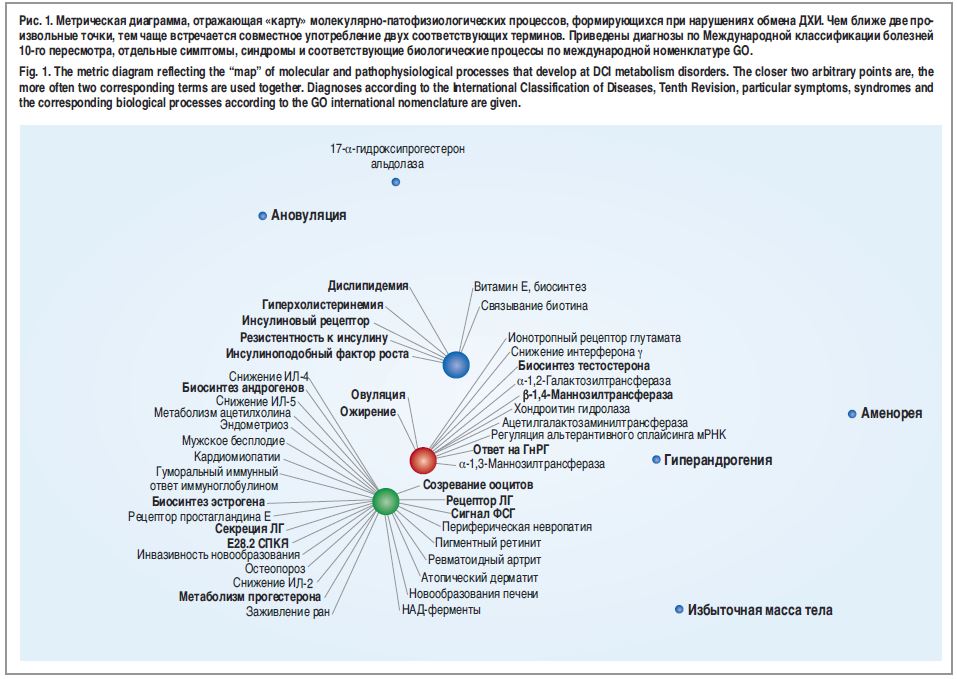Полученная карта молекулярно-патофизиологических процессов описывает сложные взаимодействия между нарушениями обмена ДХИ, СПКЯ (Международная классификация болезней 10-го пересмотра – E28.2), нарушениями овуляции, ожирением, ассоциированными с многочисленными нарушениями гормональной активности. Экспериментальные и клинические исследования показывают, что обмен ДХИ тесно взаимосвязан с такими биологическими процессами, как: