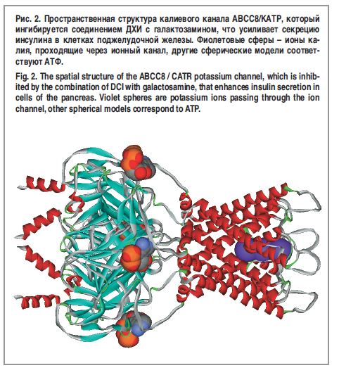 Рис. 2. Пространственная структура калиевого канала ABCC8/КАТР, который ингибируется соединением ДХИ с галактозамином, что усиливает секрецию инсулина в клетках поджелудочной железы. Фиолетовые сферы – ионы калия, проходящие через ионный канал, другие сферические модели соответствуют АТФ.
