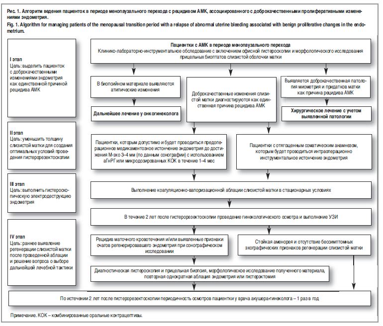 Основываясь на ранее проведенных исследованиях [18], нами составлен алгоритм ведения пациенток в периоде менопаузального перехода с рецидивом АМК, обусловленного доброкачественными изменениями в эндометрии. Разработанный алгоритм состоит из нескольких этапов (рис. 1).