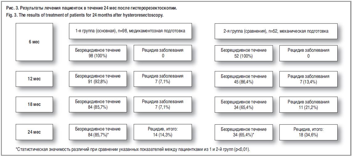 Следовательно, комплексное противорецидивное лечение пациенток в периоде менопаузального перехода с АМК, включающее предоперационно достигнутую медикаментозную атрофию эндометрия с последующей гистерорезектоскопией, способствует улучшению результатов лечения пациенток по сравнению с механическим истончением эндометрия перед гистерорезектоскопией.