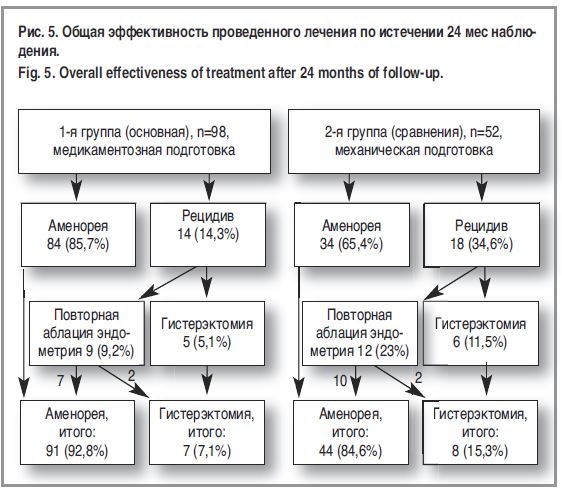Обобщение данных, представленных на рис. 5, показывает, что в 1-й группе аменорея с учетом повторного вмешательства достигнута у 91 (92,8%) пациентки, при этом 7 (7,1%) выполнена тотальная гистерэктомия в результате прогрессирования заболеваний миометрия. Во 2-й группе стойкая аменорея с учетом повторного вмешательства достигнута у 44 (84,6%) пациенток, 8 (15,3%) пациенткам проведена тотальная гистерэктомия в результате прогрессирования заболеваний миометрия и рецидива пролиферации эндометрия, расцененного как риск гиперплазии эндометрия.
