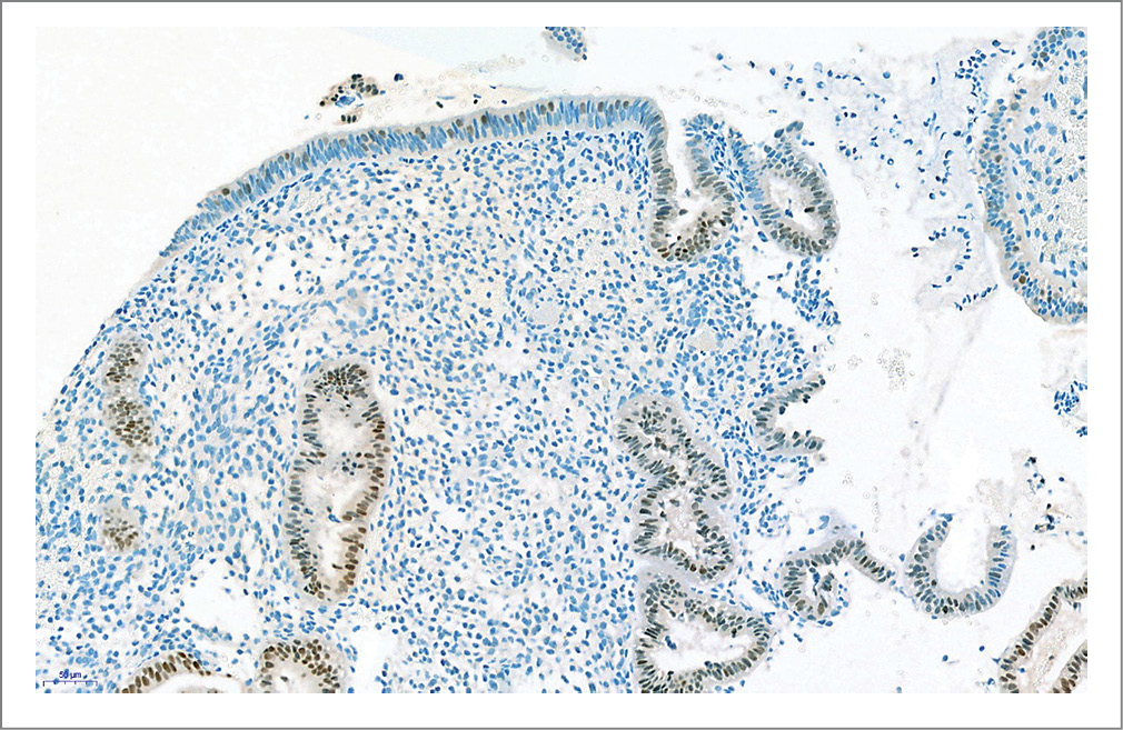 Рис. 3. Иммуногистохимическое исследование эндометриального образца: сниженная экспрессия FOXA2 в эндометрии (6–8-й д.п.о.), увеличение ×18,8.