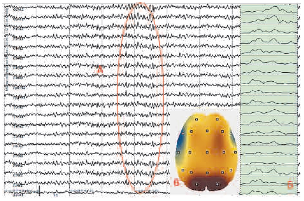 Рис. 1. ЭЭГ пациентки с антеризацией: а – фоновая запись (a-ритм представлен равномерно во всех отведениях); б – амплитудный спектр a-ритма по отведениям (a-ритм полиморфный, наблюдается его постепенное замедление); в – распределение a-ритма по поверхности головы (a-ритм распределен по всей поверхности головы, и имеет место смещение a-ритма в теменную область).