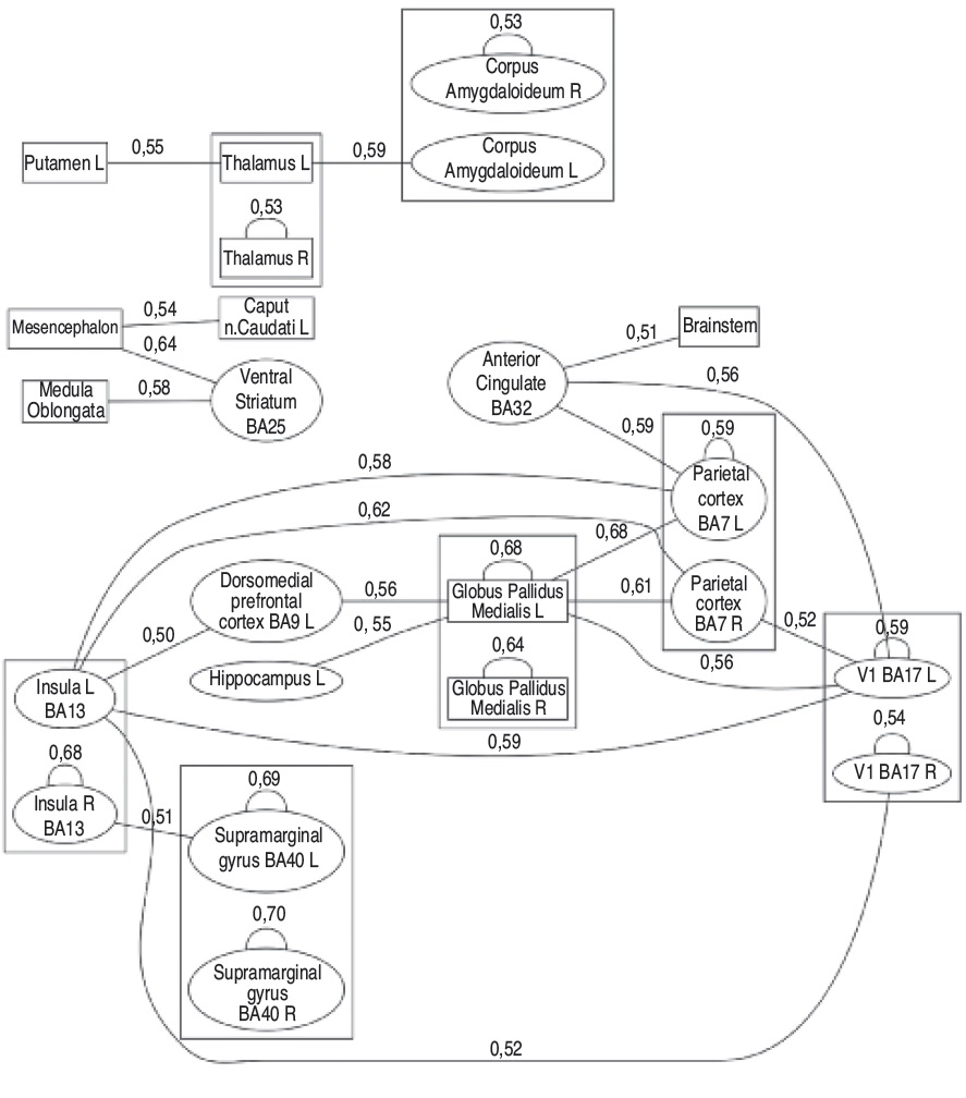 Примечание. Цифрами около соответствующих связей показаны значения коэффициентов корреляции. Подкорковые образования представлены прямоугольниками, области коры – овалами.