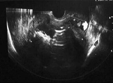 Рис. 1. Трансвагинальное УЗИ органов малого таза на момент поступления пациентки в стационар (по задней стенке визуализируется образование, расположенное интерстициально-субмукозно, неоднородной структуры).