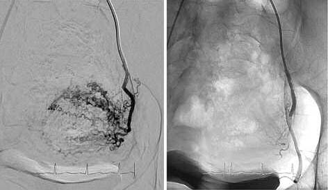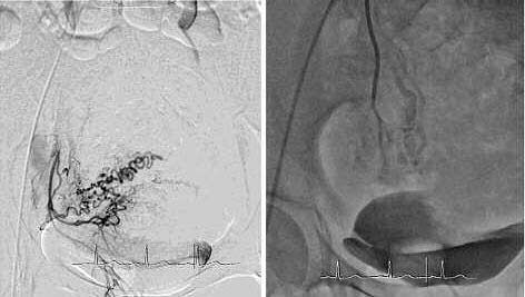 Рис. 3. Процедура ЭМА. Ангиограмма правой маточной артерии до введения (а) и после введения эмболизата (б).