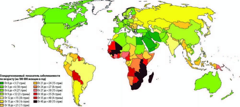 Рак является одной из ведущих проблем общественного здравоохранения повсеместно [1]. Рак шейки матки (РШМ) является наиболее предотвратимым из всех основных злокачественных опухолей человека. В структуре злокачественных процессов среди женского населения злокачественные новообразования (ЗНО) шейки матки занимают 1-е место в когорте пациенток молодого репродуктивного возраста 15–39 лет и являются также наиболее распространенной причиной смерти от ЗНО в развивающихся странах. Согласно статистическим данным Всемирной организации здравоохранения эта статистика намного хуже в слаборазвитых и развивающихся странах. В развивающихся и слаборазвитых странах РШМ считается наиболее распространенным или одним из самых распространенных видов рака с ежегодной заболеваемостью около 440 тыс. новых случаев. Приблизительно 570 тыс. случаев РШМ и 311 тыс. случаев смерти от этого заболевания произошли в 2018 г. во всем мире. РШМ был 4-м по распространенности раком среди женщин после рака молочной железы (2,1 млн случаев), колоректального рака (0,8 млн) и рака легких (0,7 млн). Стандартизованный показатель заболеваемости составил 13,1 на 100 тыс. женщин во всем мире и широко варьировал между странами, причем показатели варьировали от менее 2 до 75 на 100 тыс. женщин (рис. 1). РШМ был основной причиной смерти от рака у женщин в восточной, западной, средней и южной частях Африки. Самая высокая заболеваемость отмечалась в Эсватини, в данном государстве приблизительно у 6,5% женщин развивается РШМ в возрасте до 75 лет. Китай и Индия вместе составили более 1/3 глобального бремени РШМ: 106 тыс. случаев в Китае и 97 тыс. случаев в Индии, 48 тыс. смертей в Китае и 60 тыс. смертей в Индии. Во всем мире средний возраст на момент постановки диагноза РШМ составлял 53 года, в диапазоне от 44 лет (Вануату) до 68 лет (Сингапур).