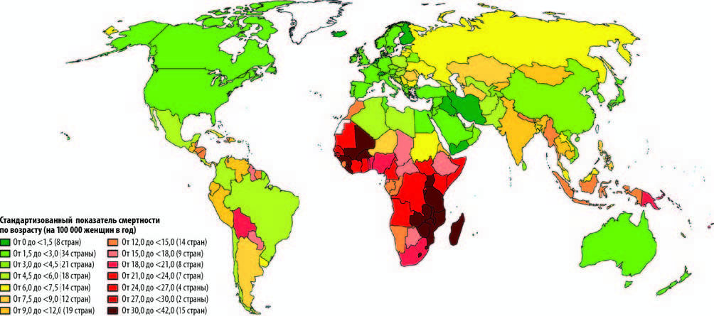 Средний возраст смерти от РШМ составил 59 лет, в диапазоне от 45 лет (Вануату) до 76 лет (Мартиника). РШМ входит в тройку самых распространенных видов рака, поражающих женщин моложе 45 лет в 146 (79%) из 185 обследованных стран. Около 84% всех случаев РШМ и 88% всех смертей от данного заболевания произошли в странах с ограниченными ресурсами (рис. 2).