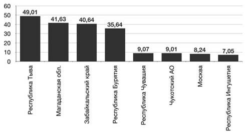 Рис. 3. Стандартизованные показатели заболеваемости РШМ (‰) на территории РФ в 2018 г.