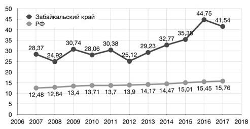 Рис. 5. Заболеваемость РШМ на территории РФ и Забайкальского края в 2007–2017 гг.