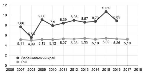 В Забайкальском крае в 2017 г. смертность от РШМ составила 7,17‰. Данный показатель выше общероссийских значений на 38,41%. В динамике за 10 лет отмечается снижение смертности населения на территории Забайкальского края на 6,39% (рис. 6).