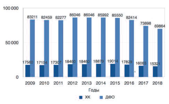 Снижение показателей МлС и ПС в ХК происходит в основном за счет снижения РНС в 3,3 раза (р<0,001), тогда как в ДФО и РФ снижение РНС произошло только в 2,3 (р=0,01) и в 1,8 раза соответственно.