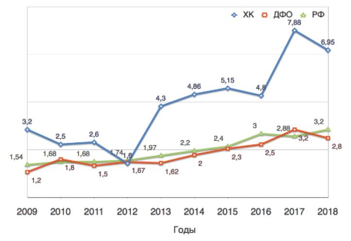 Сравнительный анализ показателей МлС в ХК, ДФО и по Российской Федерации показал (рис. 2), что динамика показателя МлС в ХК имеет положительную тенденцию к снижению, особенно в период 2015–2018 гг.
