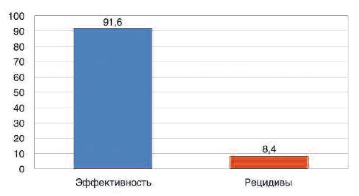 Оценивались эффективность терапии и частота рецидивирования с учетом динамики субъективных жалоб, клинической картины заболеваний и лабораторных критериев через 2 нед после окончания лечения, через 3 и 6 мес. Оценку эффективности лечения препаратом проводили по 3 критериям: