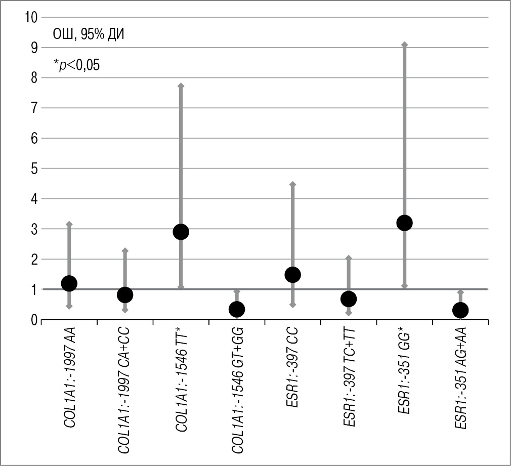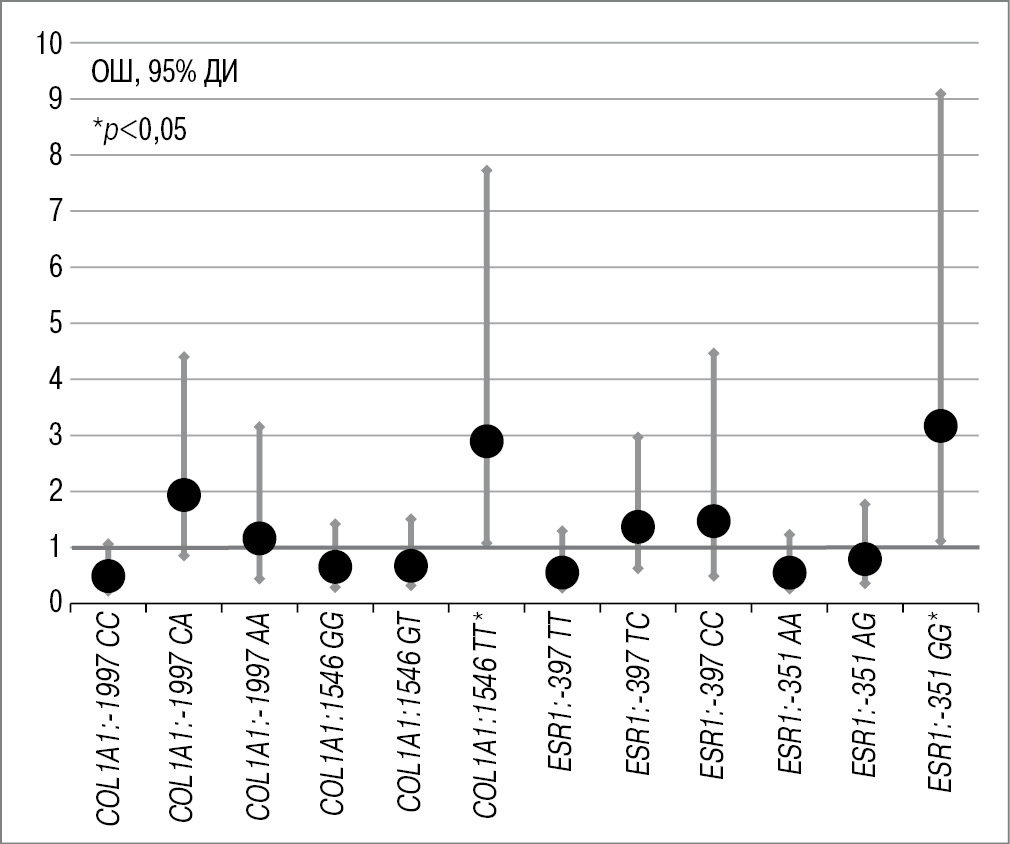 При анализе распределения генотипов по полиморфным маркерам исследуемых генов выявлено, что вариант гена GG эстрогенового рецептора ESR1:-351 [отношение шансов – ОШ 3,182 (95% доверительный интервал – ДИ 1,114; 9,089); p<0,05] и вариант гена ТТ гена COL1A1:1546 [ОШ 2,887 (95% ДИ 1,079; 7,722); p<0,05] регистрировались значимо чаще у пациенток с СНМ, чем у пациенток группы сравнения (табл. 2, рис. 1).