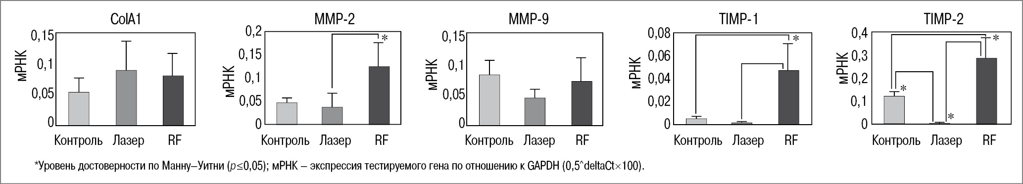Сравнительный анализ экспрессии генов коллагеногенеза в ткани влагалища до и после воздействия лазером и методом динамической радиочастотной терапии выявил различие в экспрессии следующих генов: увеличение экспрессии MMP-2 в 10 раз (p=0,022), TIMP-1 в 18 раз (p=0,022) и TIMP-2 в 250 раз (p=0,0002) в группе RF по сравнению с группой лазерной терапии; увеличение экспрессии TIMP-1 в 7 раз (p=0,003) и TIMP-2 в 4 раза (p=0,05) в группе RF по сравнению с группой до лечения; а также снижение экспрессии TIMP-2 в 64 раза (p=0,0001) в ткани влагалища женщин в группе LR по сравнению с группой до лечения.