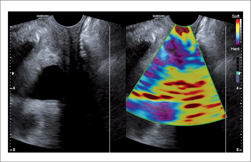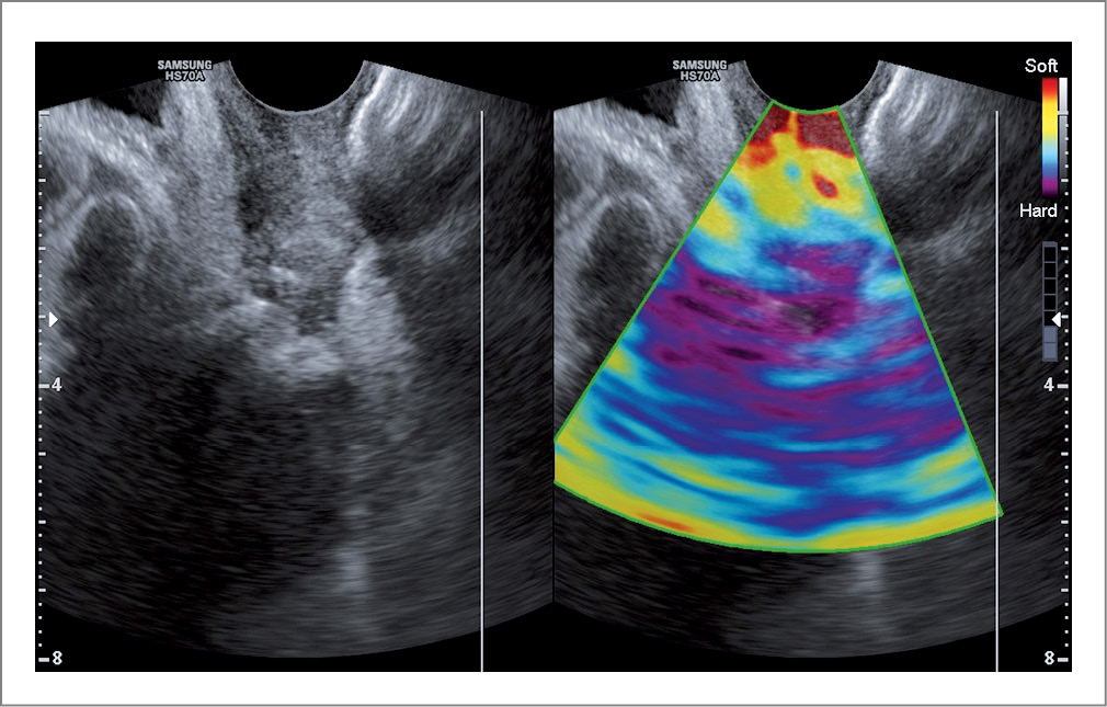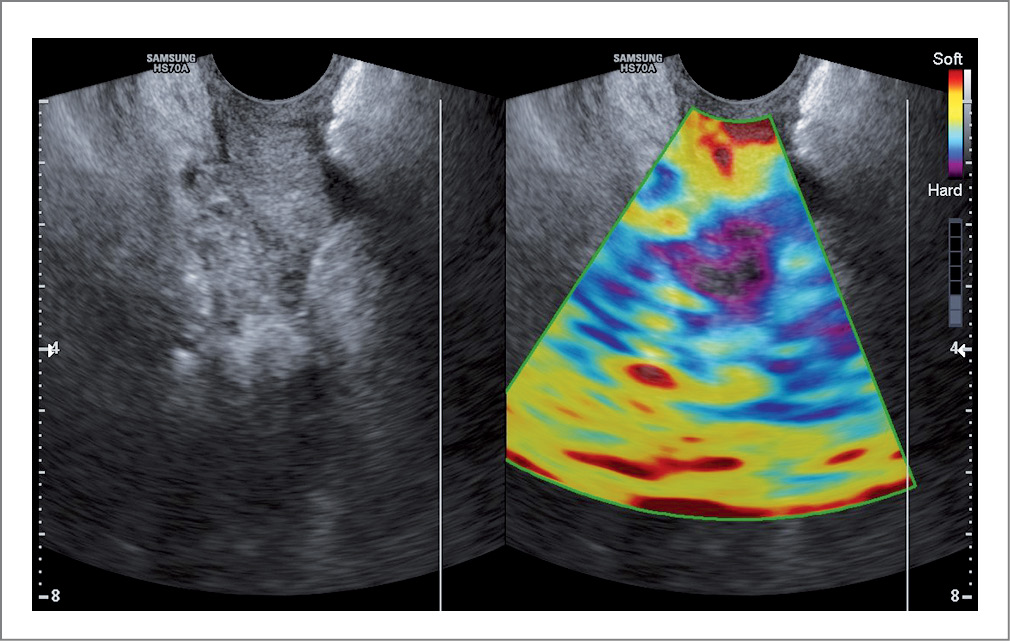 Рис. 2. Ультразвуковое исследование с эластографией до операции. / Fig. 2. Preoperative ultrasound with elastography.