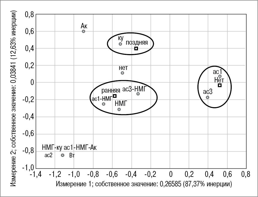 Эффективность сочетаний различных препаратов для профилактики ПЭ исследовали с помощью анализа факторных соответствий.