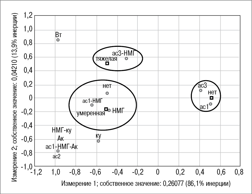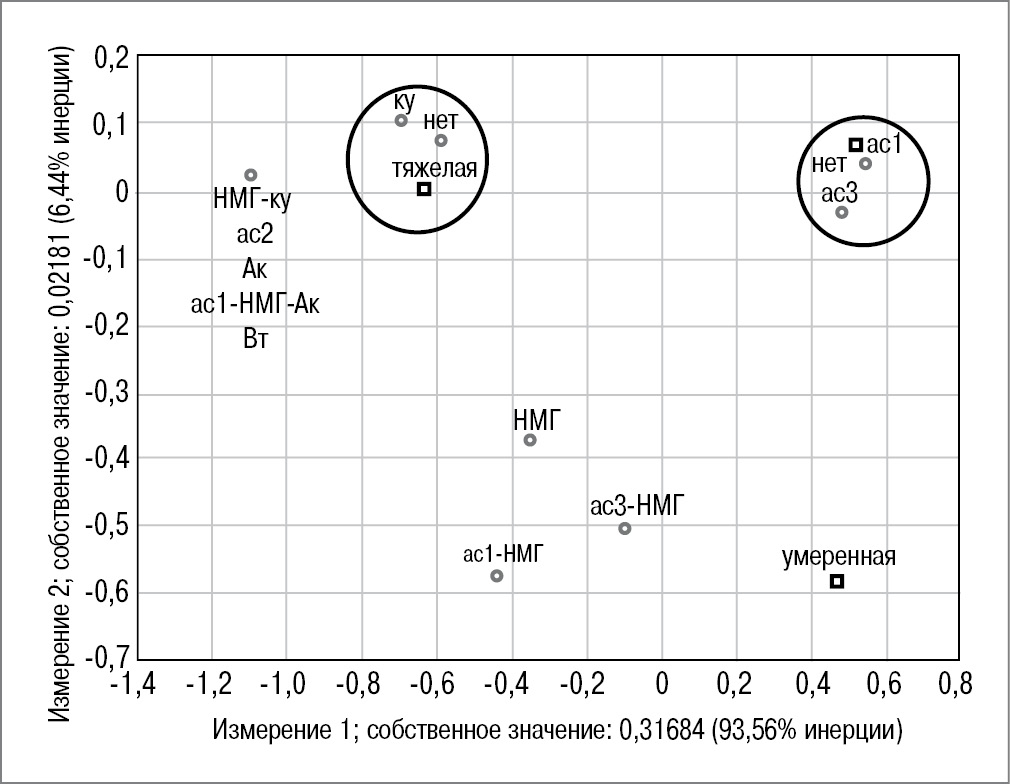 Рис. 2. Двумерное шкалирование наиболее вероятных сочетаний при постановке диагноза ПЭ различной степени тяжести. / Fig. 2. Two-dimensional scaling of the most likely combinations when diagnosing PE of varying severity.